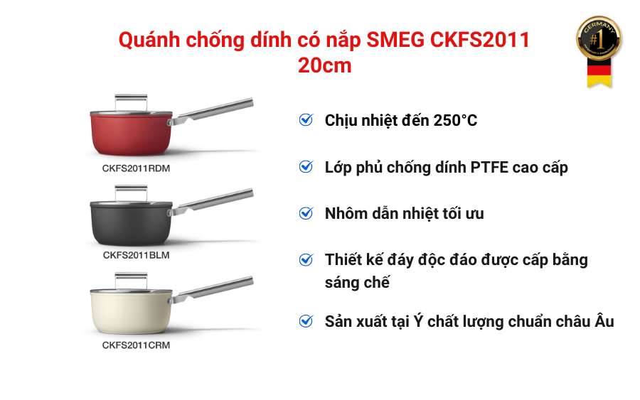 Quánh chống dính SMEG 20 cm có nắp là một trong những sản phẩm tiêu biểu, kết hợp thiết kế retro Ý cùng công nghệ chế tác chất lượng cao để mang đến trải nghiệm nấu nướng trọn vẹn, đẹp mắt, tiện dụng và đẳng cấp.