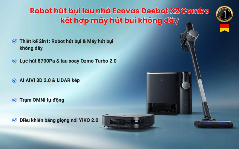 Ecovacs Deebot X2 Combo kết hợp hoàn hảo giữa robot hút bụi lau nhà và máy hút bụi cầm tay không dây – mang lại giải pháp làm sạch linh hoạt, toàn diện từ sàn đến sofa, từ mặt phẳng đến các góc cao, khe kẽ hẹp. Sản phẩm được tối ưu hóa để xử lý hiệu quả cả bụi mịn lẫn rác lớn, giúp bạn tiết kiệm thời gian, công sức nhưng vẫn đảm bảo không gian sống sạch hoàn hảo.