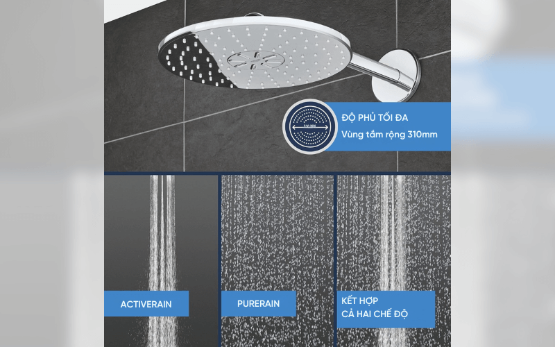 Với 3 van riêng biệt, bạn có thể bật cùng lúc cả bát sen trần (với các chế độ phun khác nhau) và tay sen, hoặc chuyển đổi qua lại giữa chúng một cách dễ dàng.