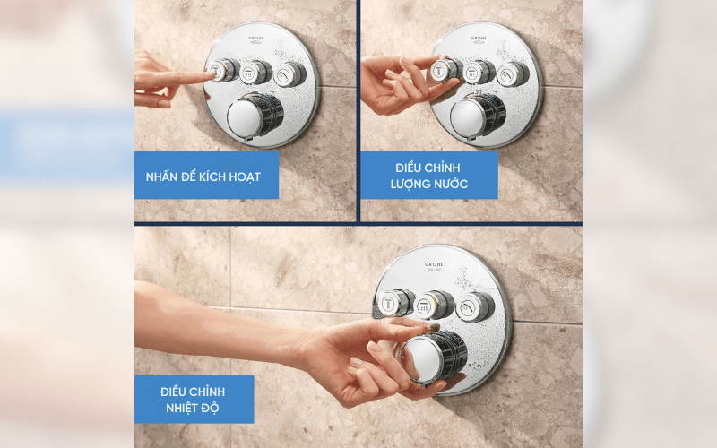 Với công nghệ GROHE SmartControl tiên tiến, bạn có thể dễ dàng điều khiển và kiểm soát mọi bộ phận của vòi sen với các nút xoay: Chọn vòi mong muốn và cài đặt lưu lượng nước mong muốn – từ lưu lượng tiết kiệm nước đến tia nước mạnh > Nhấn nút > Xoay là xong.