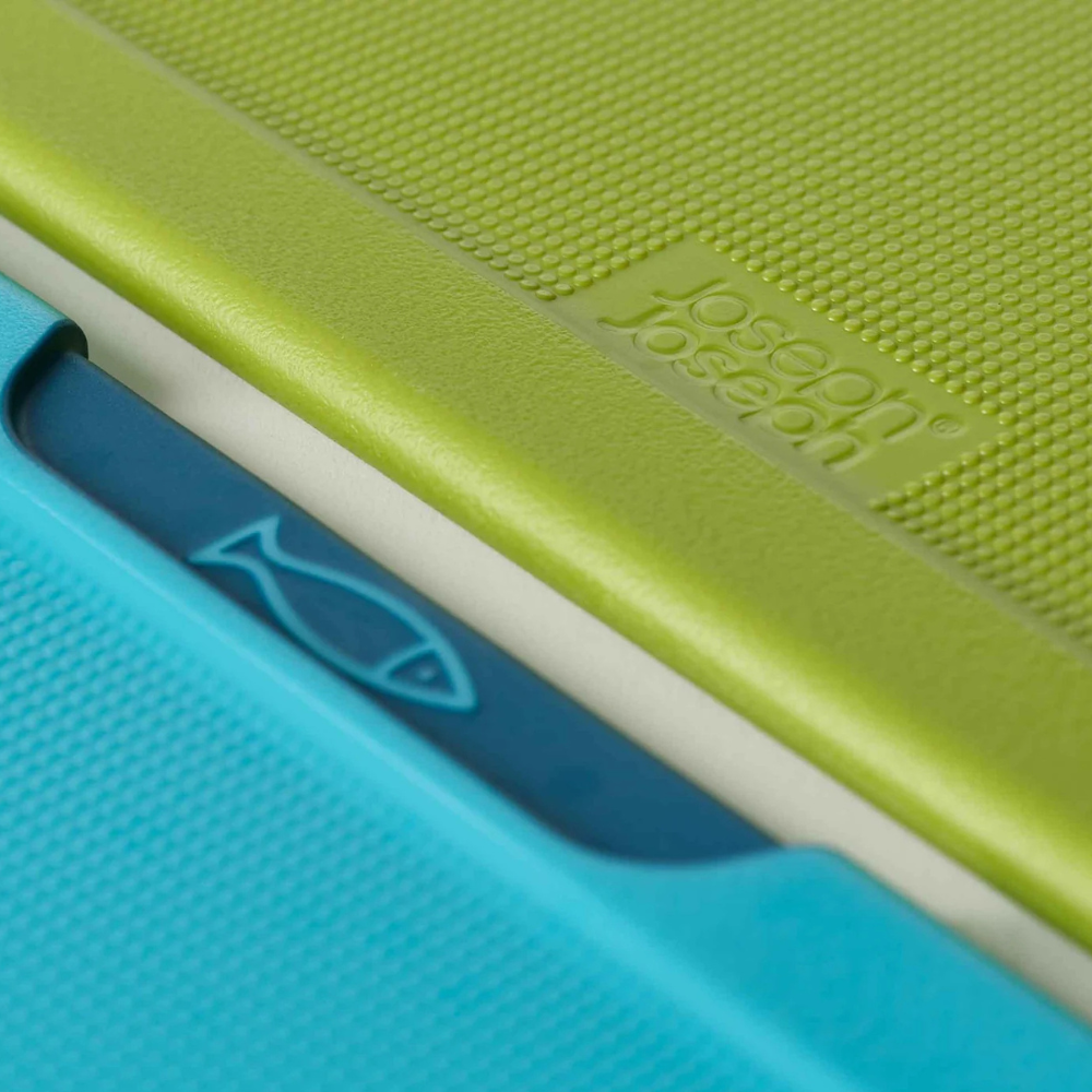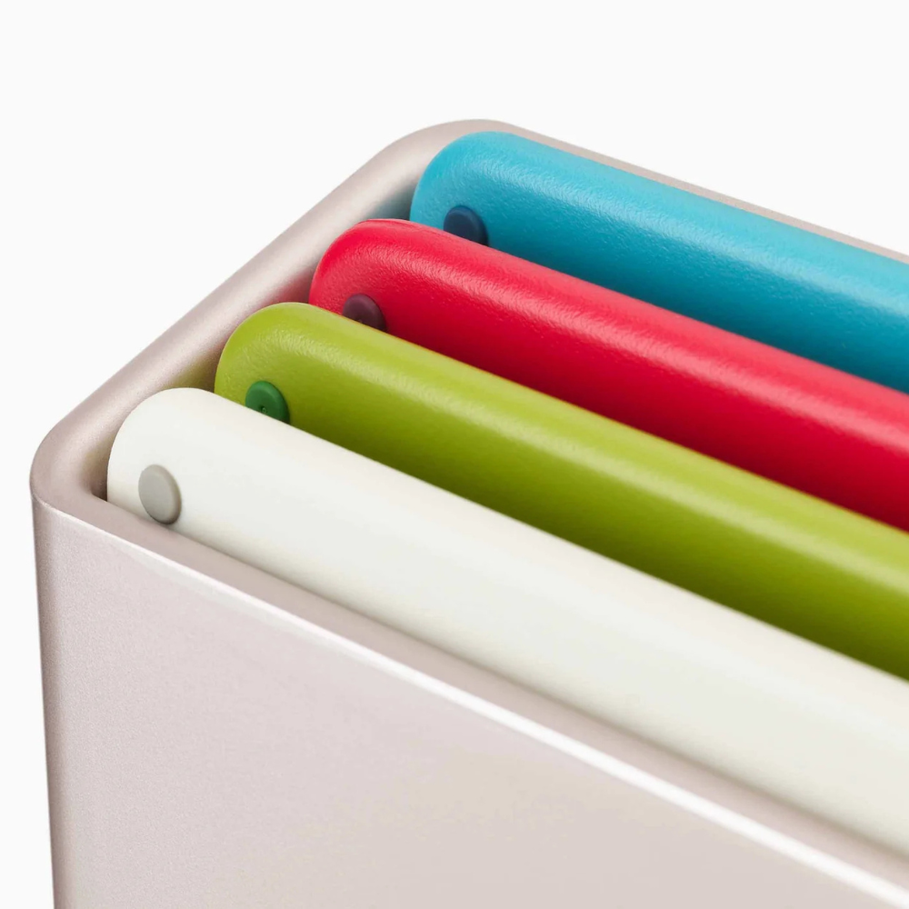 Bộ 4 thớt Joseph Joseph 60230 Folio có thiết kế thông minh với 4 mã màu và các biểu tượng ở phần tay cầm giúp người dùng dễ dàng phân biệt thớt cho từng loại thực phẩm, bao gồm: