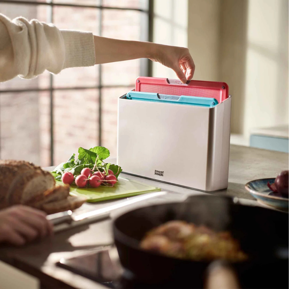 Hộp đựng đi kèm bộ thớt Joseph Joseph Folio có thiết kế mỏng và thanh lịch, người dùng dễ dàng đặt gọn vào bất kỳ góc nào trong gian bếp mà không chiếm quá nhiều diện tích.