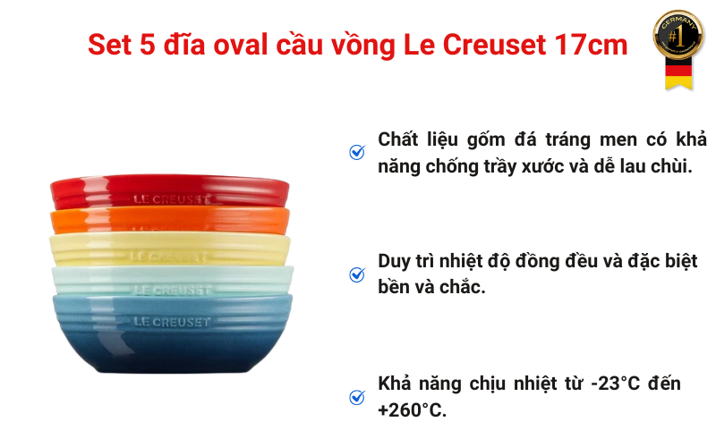Nhiều gia chủ thường gặp khó khăn trong việc lựa chọn bộ bát đĩa vừa đẹp mắt, vừa bền chắc để dùng trong cả bữa ăn hằng ngày lẫn khi đãi khách. Set 5 đĩa oval cầu vồng Le Creuset 17cm chính là giải pháp hoàn hảo: chất liệu đồ đá tráng men chống trầy xước, giữ nhiệt đồng đều, chịu được nhiệt độ từ -23°C đến +260°C và đa năng cho cả lò vi sóng, lò nướng. Hãy khám phá ngay cùng Germany S&T để thấy sản phẩm này có thể nâng tầm trải nghiệm ẩm thực trong gian bếp của bạn!