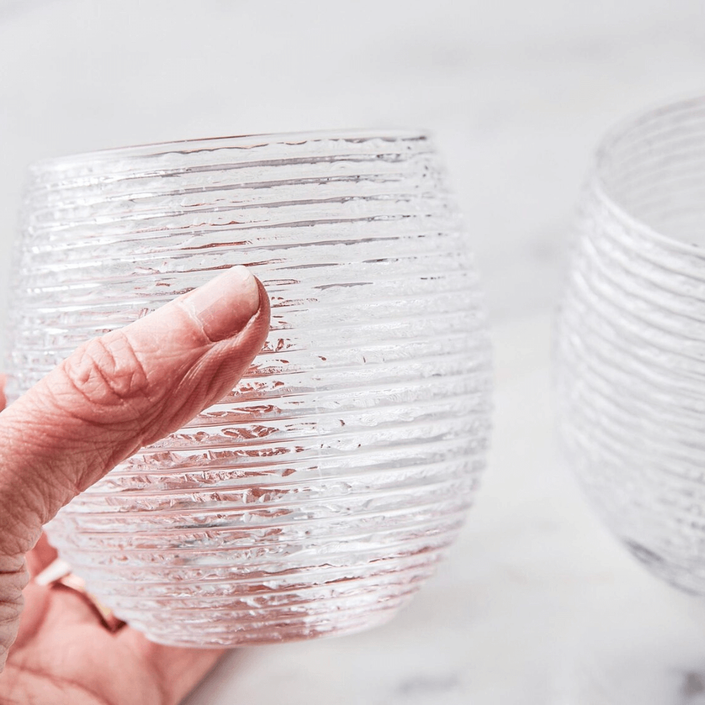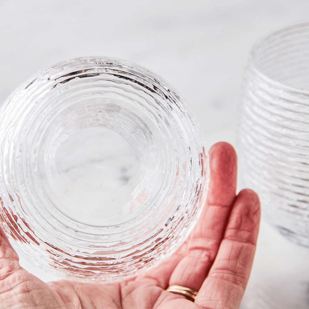 Bề mặt cốc được tạo hình bằng các đường sọc ngang nổi đều, bao phủ toàn thân cốc một cách mềm mại. Khi kết hợp cùng các gam màu Multicolor, họa tiết sọc giúp ánh sáng khúc xạ đa chiều, tạo hiệu ứng màu sắc thay đổi theo góc nhìn. Thiết kế bo tròn thân cốc lmang lại cảm giác cầm chắc tay và hài hòa về thị giác.