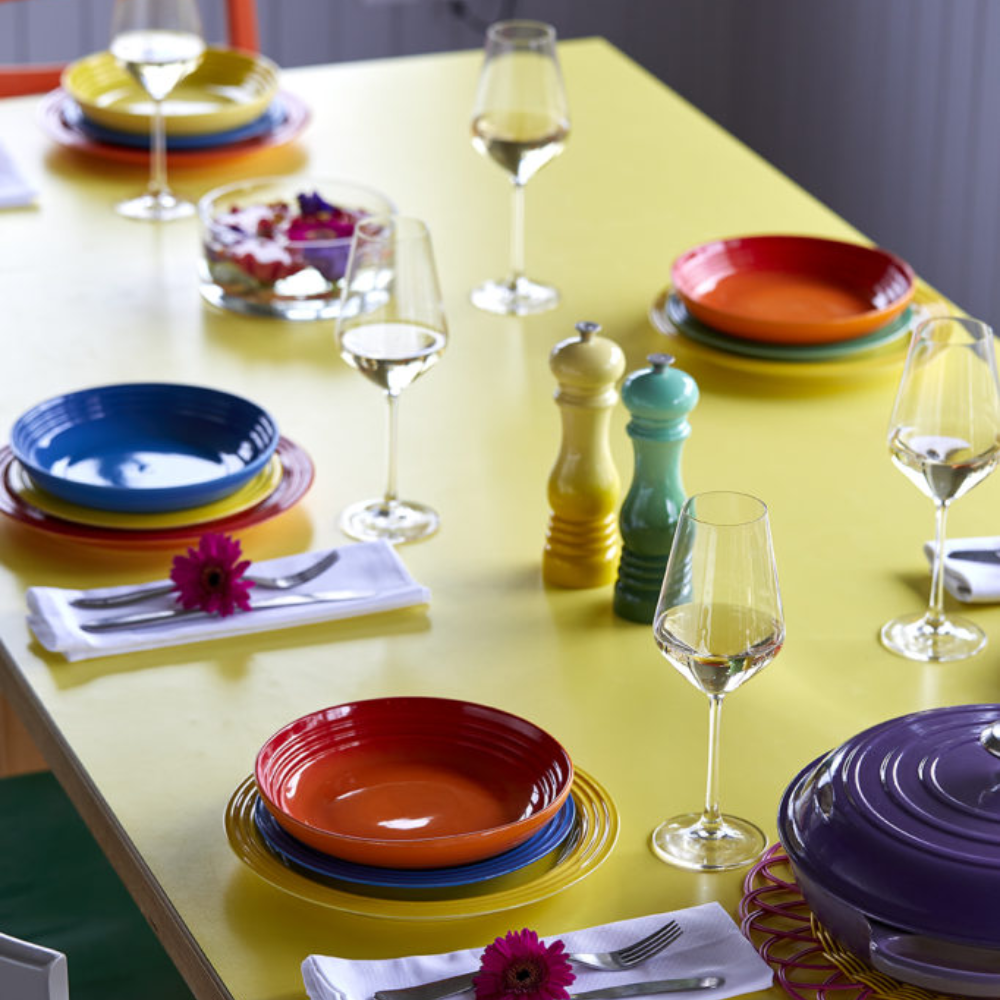 Sức mạnh nằm ở màu sắc: Màu sắc nâng cao tâm trạng và thiết lập khung cảnh cho các món ăn yêu thích của bạn một cách hoàn hảo. Hãy tận hưởng bảng màu rực rỡ của bộ sưu tập sáu đĩa ăn sáng này, được làm thủ công từ đồ đá. Nhờ có độ lõm nhẹ, đĩa cũng thích hợp cho các món ăn với nước sốt. Ba vòng trên mép đĩa tượng trưng cho thiết kế độc đáo của Le Creuset.