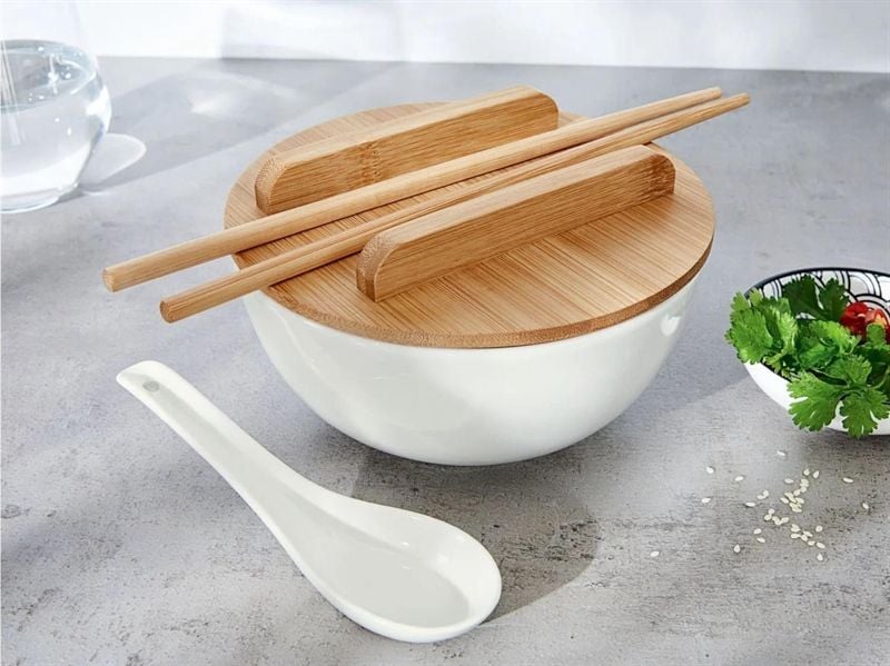 Set bát sứ nắp tre kèm thìa, đũa ăn mỳ phở ERNESTO