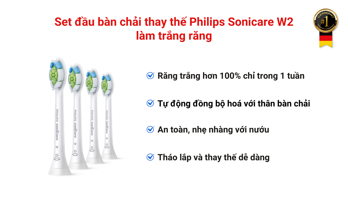 Đầu bàn chải Philips Sonicare W2 Optimal White mang đến nụ cười trắng sáng hơn đến 100% chỉ sau một tuần sử dụng. Với thiết kế lông bàn chải dày đặc, ôm sát bề mặt răng và công nghệ sóng âm độc quyền của Philips, sản phẩm giúp loại bỏ vết ố, mảng bám hiệu quả, trả lại độ sáng tự nhiên cho men răng. Đây là lựa chọn lý tưởng cho những ai muốn duy trì hàm răng trắng khỏe, rạng rỡ sau liệu trình làm trắng hoặc trong chăm sóc hàng ngày. Hãy cùng Germany S&T khám phá sản phẩm này nhé!