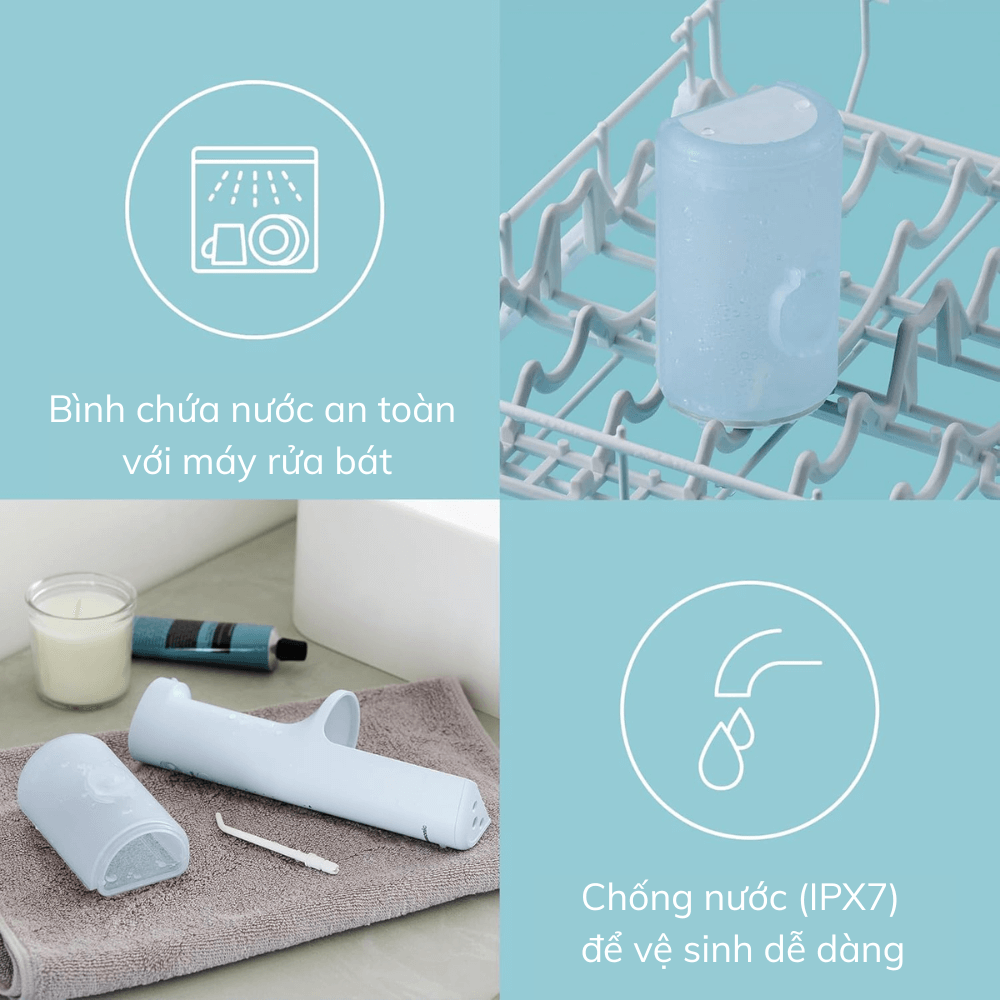 Bình chứa nước dung tích 200 ml có thể tháo dời và vệ sinh dễ dàng bằng máy rửa bát, đảm bảo thiết bị luôn sạch sẽ, khô ráo và ngăn ngừa vi khuẩn tích tụ. Dung tích này đủ để sử dụng trong 50 giây liên tục – thời lượng lý tưởng để làm sạch toàn bộ khoang miệng một cách hiệu quả.