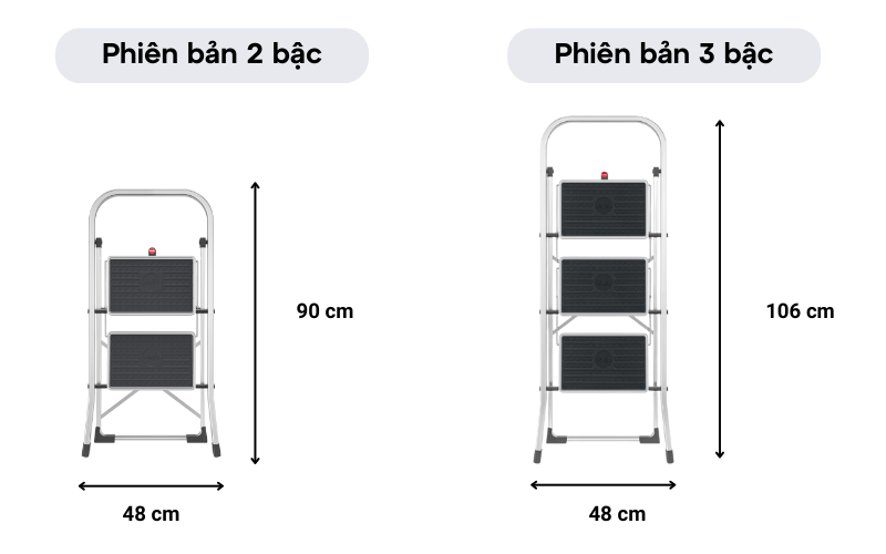 - Loại 2 bậc với chiều cao bậc cao nhất là 47 cm, phù hợp khi lấy đồ trên kệ bếp hoặc lau chùi tủ thấp.