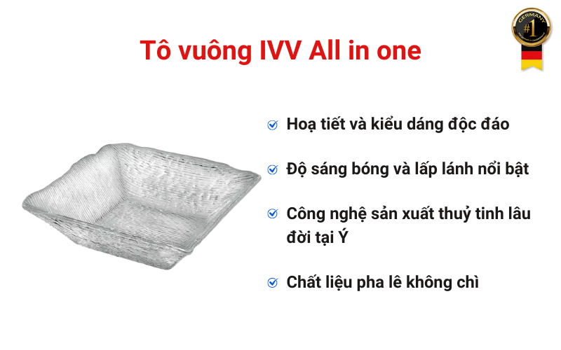 Tô vuông IVV All in one với thiết kế tỉ mỉ, chất liệu pha lê không chì an toàn và độ bền cao, sản phẩm này hiện diện trong các bữa ăn hàng ngày như một biểu tượng của vẻ đẹp vượt thời gian. Đặt hàng ngay tại Germany S&T để sở hữu sản phẩm với mức giá tốt nhất!