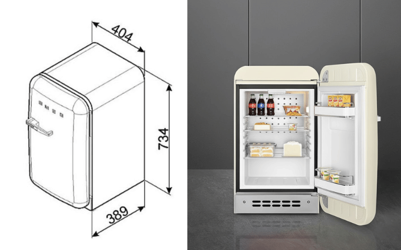 Tủ lạnh mini SMEG FAB5xxx6 sở hữu dung tích 34L cùng kích thước nhỏ gọn 40,4 x 71,5 x 56,9 cm, dễ dàng đặt trong mọi không gian như phòng ngủ, văn phòng, khách sạn, căn hộ nhỏ hay showroom.