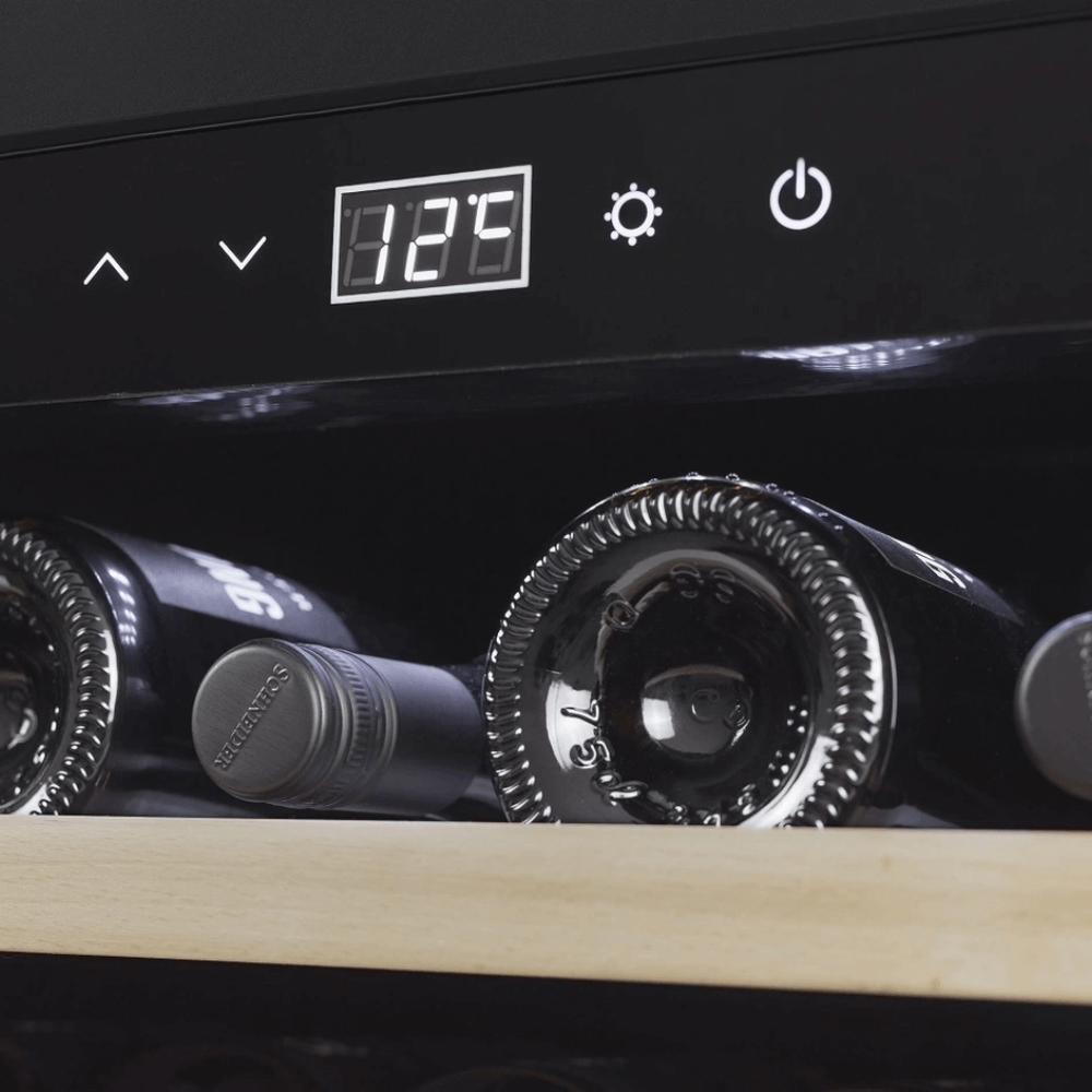 Tủ sử dụng bảng điều khiển cảm ứng với màn hình LED trắng hiển thị nhiệt độ rõ ràng. Đèn nội thất bật tắt linh hoạt phục vụ trưng bày hoặc hạn chế ánh sáng khi không cần. Thiết kế tinh gọn giúp thao tác nhanh. Kệ gỗ trượt dễ tháo rời để sắp xếp bộ sưu tập theo giống nho hoặc niên vụ.
