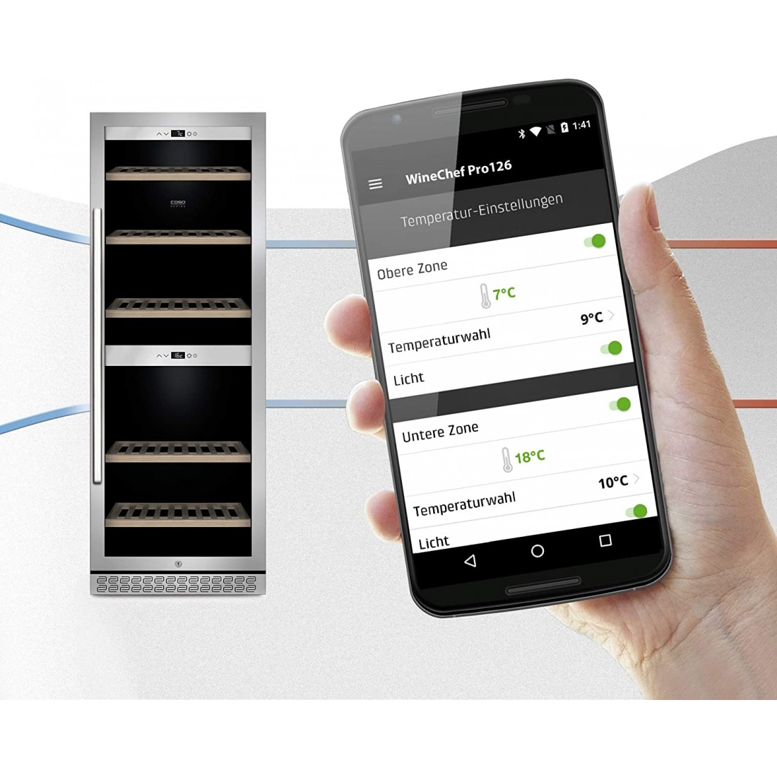 Điều khiển dễ dàng từ mọi nơi nhờ ứng dụng Caso Wine Control miễn phí. Thông qua smart phone kết nối wifi, nhiệt độ và ánh sáng có thể được điều chỉnh dễ dàng giúp tủ rượu vang Caso WineChef Pro 126-2D – 776 luôn kiểm soát được nhiệt độ để rượu vang được bảo quản tốt nhất.