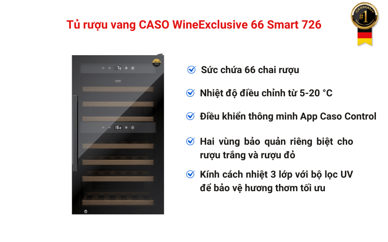 Tủ rượu vang CASO WineExclusive 66 Smart 726 không chỉ là một thiết bị bảo quản rượu, mà còn là một sự kết hợp hoàn hảo giữa công nghệ tiên tiến, thiết kế sang trọng và tiện ích vượt trội, đây chắc chắn là một khoản đầu tư xứng đáng để bảo vệ và nâng tầm giá trị những chai rượu quý của bạn. Đặt hàng ngay tại Germany S&T để sở hữu với mức giá tốt nhất!